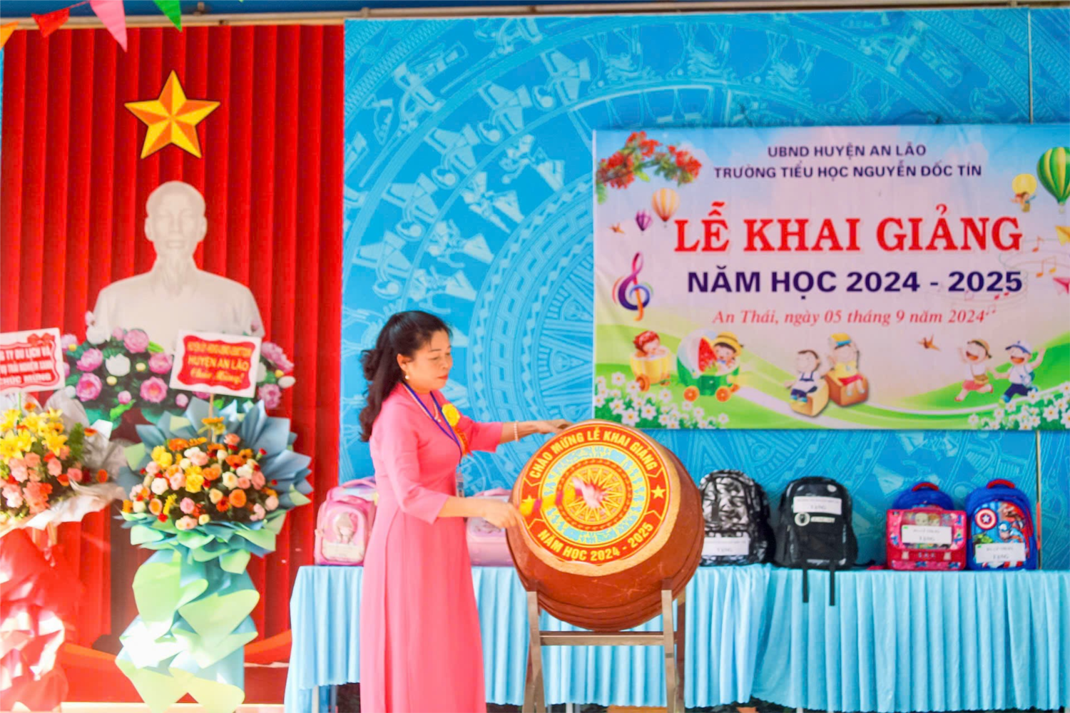 Lễ chào cờ khai giảng của các quý vị đại biểu cùng các em học sinh năm học 2024 - 2025 Thầy giáo Lê Văn Dự - Phó Bí thư Chi bộ - Phó Hiệu trưởng - Đọc thư của Bác Hồ gửi học sinh nhân ngày khai trường và thư của Tổng Bí thư, Chủ tịch nước Tô Lâm Cô giáo Đỗ Thị Liên - Bí thư chi bộ - Hiệu trưởng nhà trường đã gióng những tiếng trống rộn ràng báo hiệu một năm học mới bắt đầu. Tiếng trống rộn vang, bay xa như mang theo những hi vọng một năm học mới thành công rực rỡ với thật nhiều thành tích của cả thầy và trò trường Tiểu học Nguyễn Đốc Tín. |
