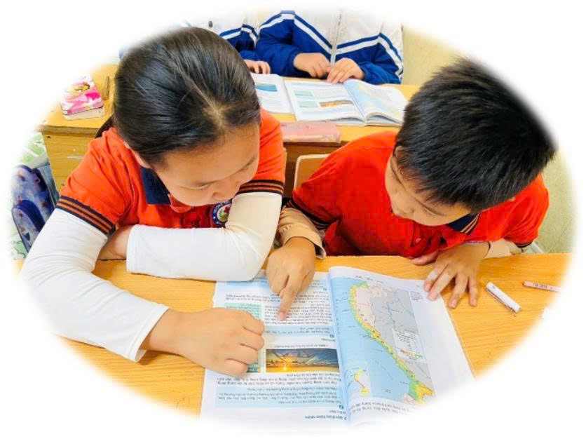 📚 Quan sát các bức ảnh, em thấy các bạn học sinh lớp 4 đang chăm chú học bài. Mỗi bạn đều mở sách giáo khoa Lịch sử và Địa lí, lặng lẽ đọc từng dòng chữ, nâng niu từng hình ảnh và bản đồ Việt Nam trước mắt. Có nhóm bạn nhẹ nhàng chỉ tay lên bản đồ 🗺️ để xác định vị trí các vùng miền của Tổ quốc; có nhóm cùng nhau trao đổi, chia sẻ suy nghĩ để hiểu sâu hơn những kiến thức đang học.