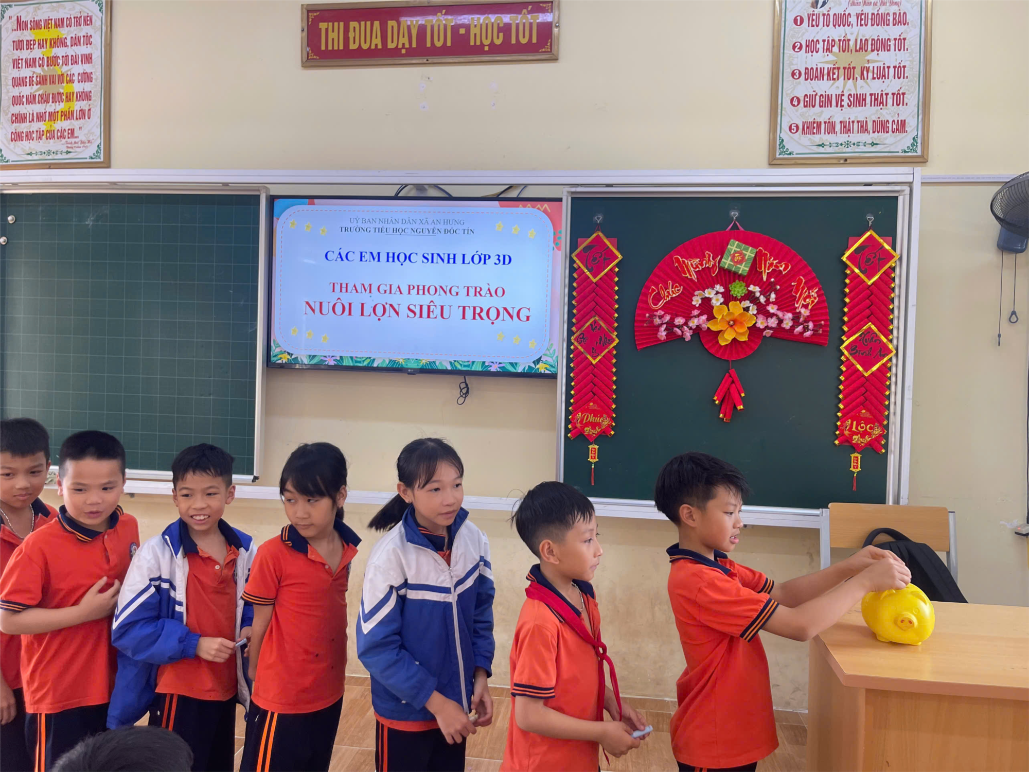 Hưởng ứng kế hoạch “Nuôi lợn siêu trọng” năm học 2025 – 2026 của Trường Tiểu học Nguyễn Đốc Tín, học sinh lớp 3D đã tích cực tham gia phong trào “Góp những đồng tiền nhỏ vì nghĩa tình lớn” với tinh thần hào hứng và trách nhiệm. Ngay từ những ngày đầu phát động, cô và trò lớp 3D đã mua lợn đất, đặt trang trọng tại tủ lớp học và cùng nhau xây dựng ý thức tiết kiệm. Mỗi ngày, mỗi tuần, các em tự giác bỏ vào lợn những đồng tiền nhỏ từ tiền tiết kiệm ăn sáng hay tiền thưởng học tập. Không chỉ là hoạt động gây quỹ, phong trào còn giúp các em hiểu sâu sắc hơn về truyền thống “tương thân tương ái”, biết chia sẻ với những bạn học sinh có hoàn cảnh khó khăn và các nạn nhân chất độc da cam. Không khí lớp học vì thế cũng trở nên ấm áp, đoàn kết hơn khi mỗi bạn nhỏ đều mong muốn chú lợn của lớp mình “nặng cân” nhất trong ngày hội mổ lợn tập thể vào đầu tháng 3. Với sự đồng lòng và quyết tâm, lớp 3D tin tưởng sẽ góp phần nhỏ bé nhưng đầy ý nghĩa vào hoạt động nhân ái chung của nhà trường.