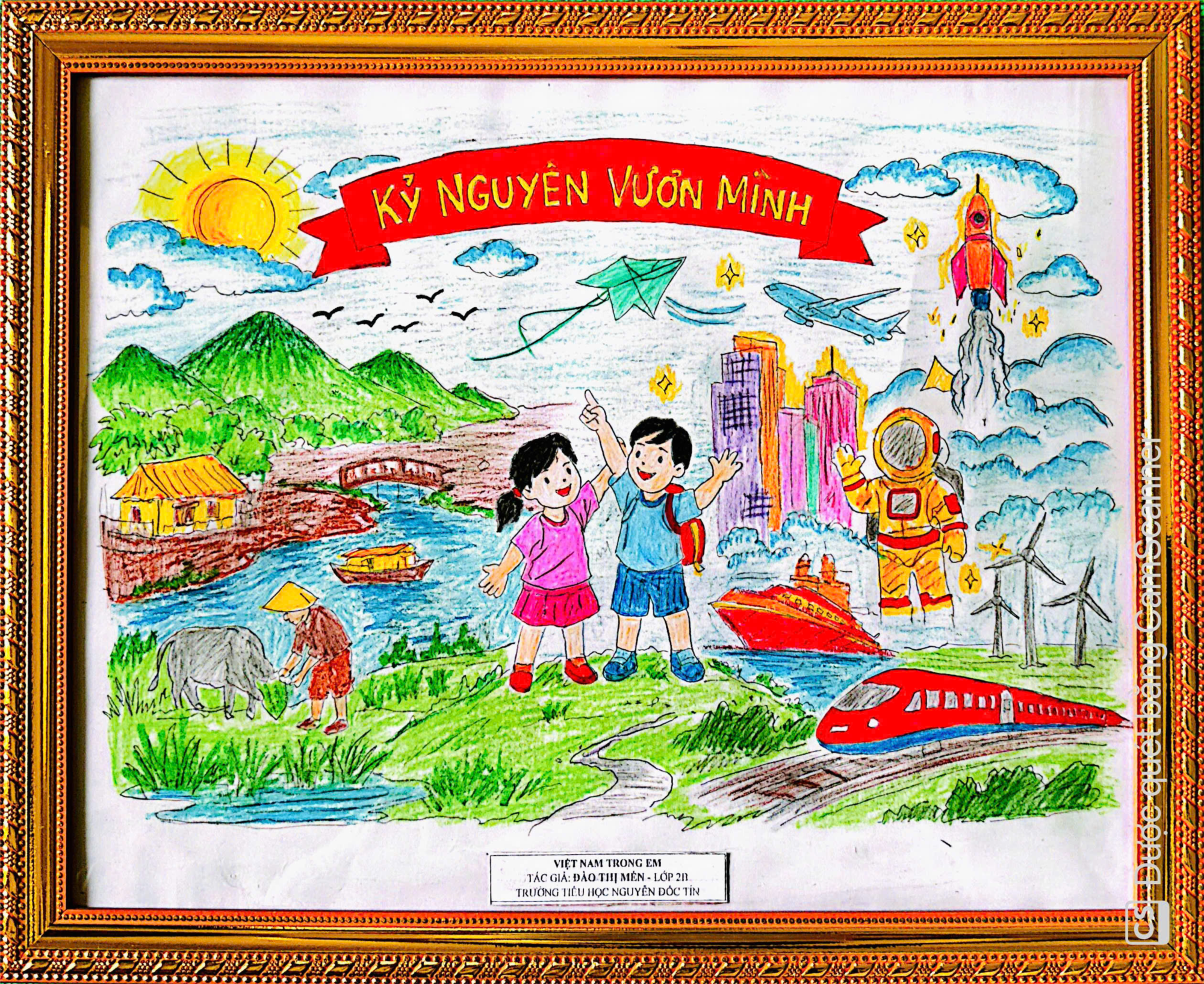 Tác phẩm mỹ thuật “Kỷ nguyên vươn mình” được thực hiện từ bản phác thảo vẽ tay, hoàn thiện bằng màu vẽ và phát triển thành tranh chuyển động với sự hỗ trợ của công nghệ cua học sinh khối 2